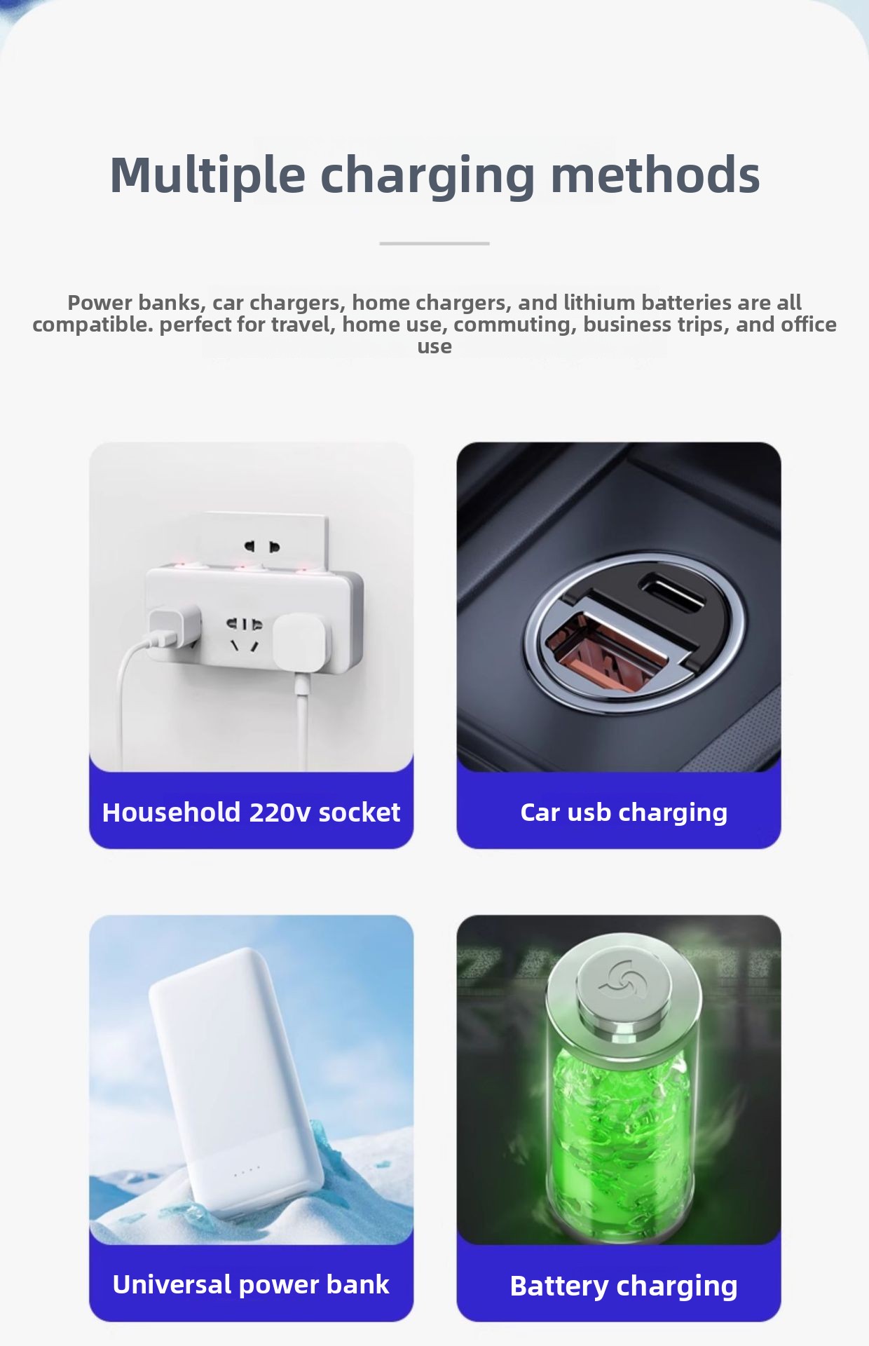 Dual Power Source: Operates via car adapter or portable power bank for versatile use.